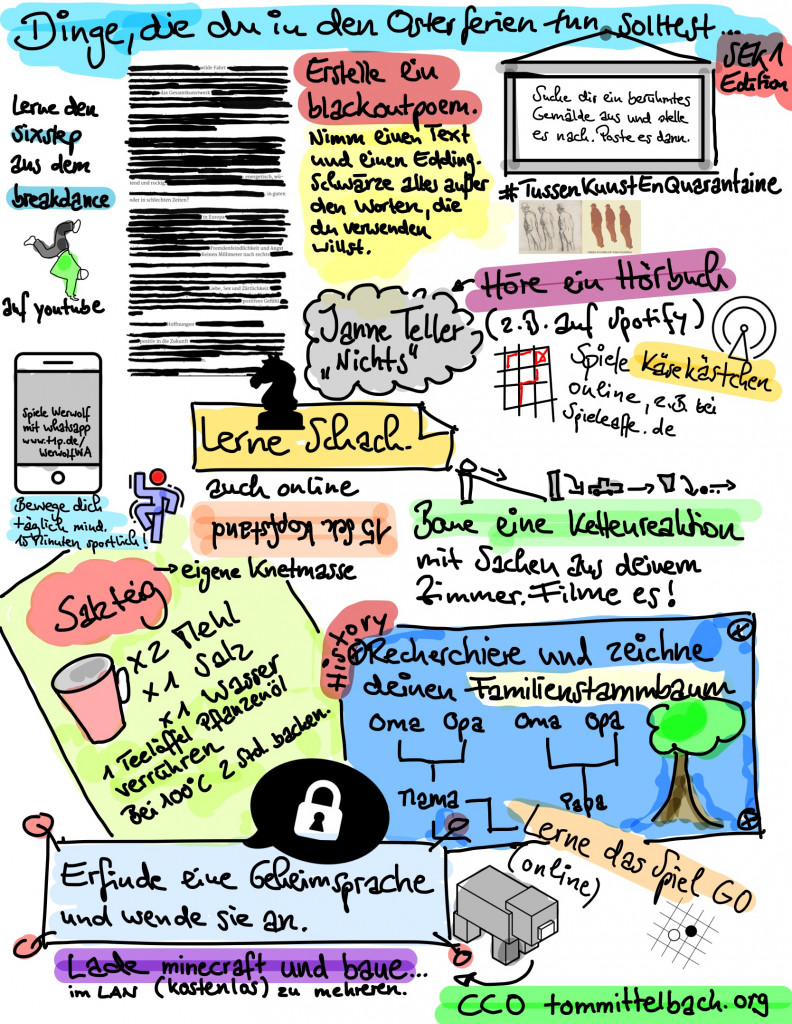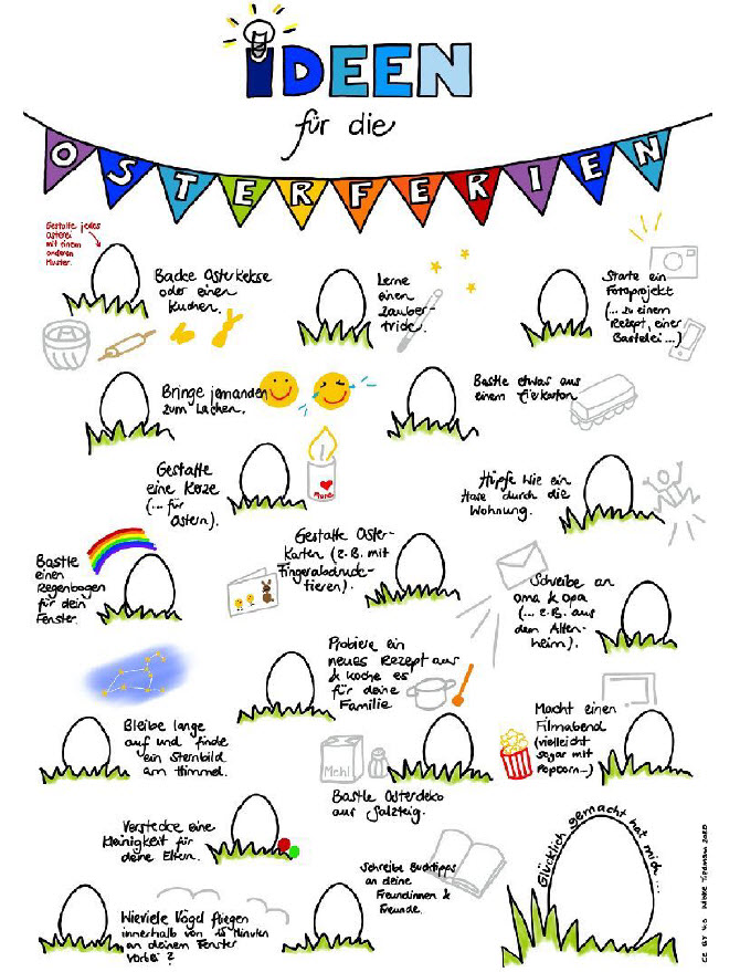 Oster steht am Wochenende an, das Wetter ist hervorragend und wir dürfen uns wegen der Coronakrise leider immer noch nicht mit Freunden treffen oder in den Urlaub fahren. Wir haben ein paar Tipps für Euch, wie Ihr kreativ die Osterferien gestalten könnt. Schaut euch die Bilder und Dokumente an, sie bieten viele unterschiedliche Ideen. Da ist bestimmt für jede*n was dabei!